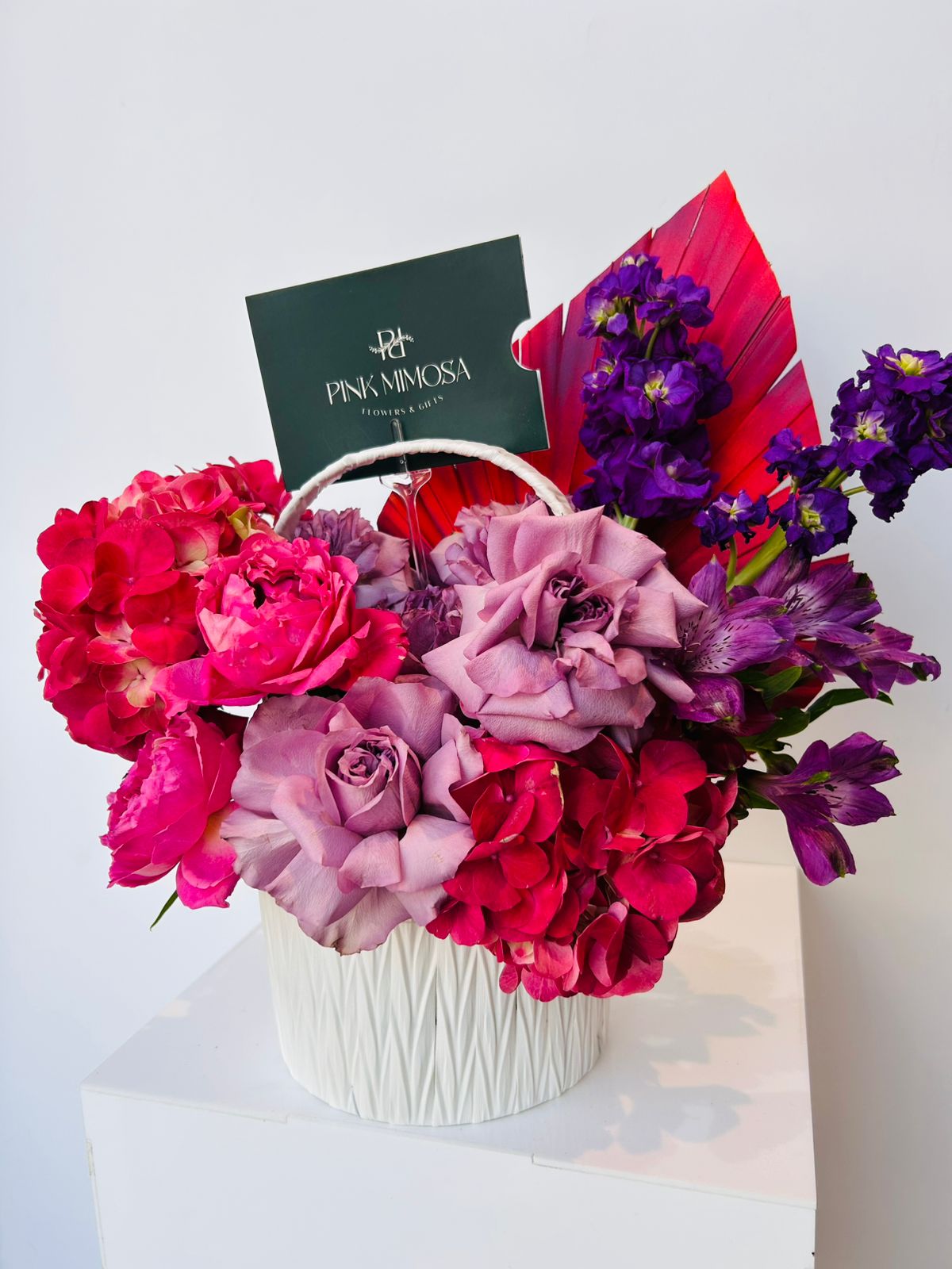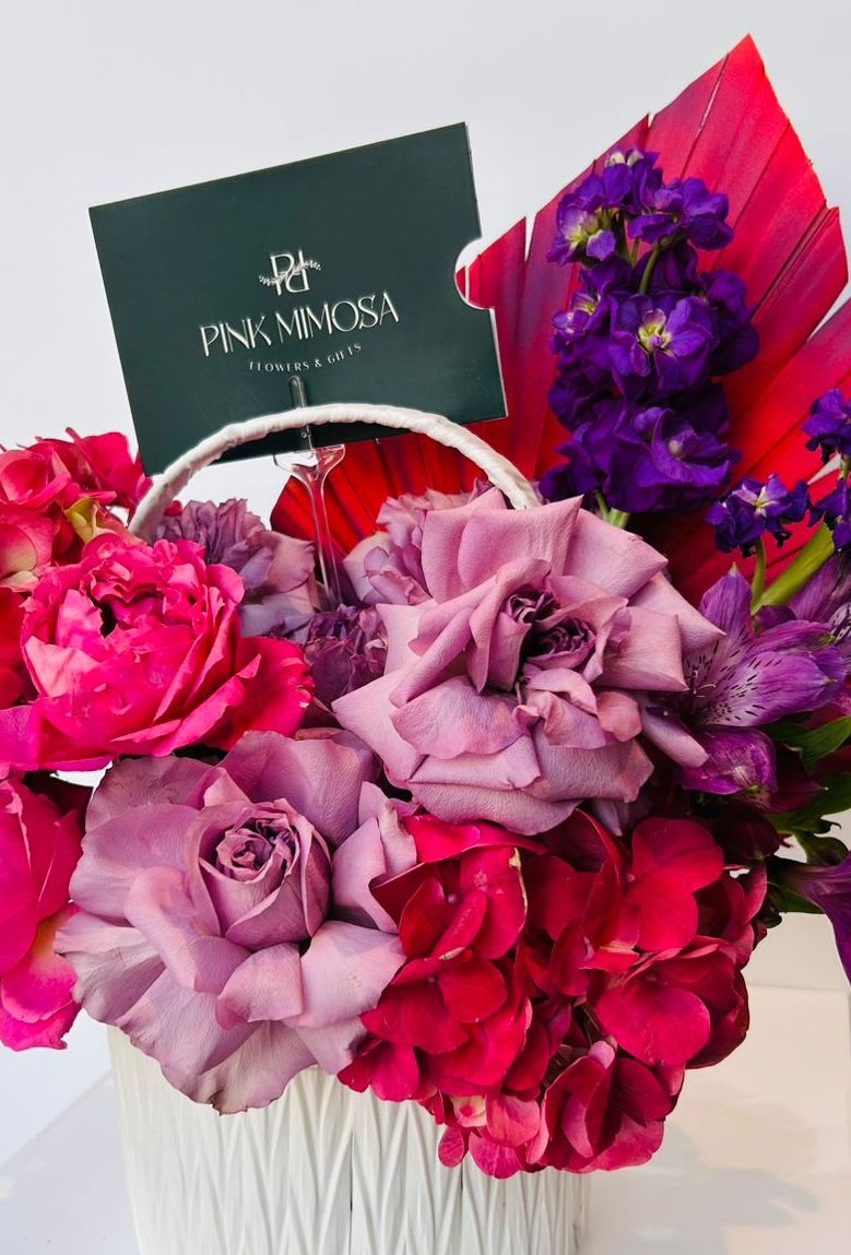 This unique basket arrangement consists of fresh flowers with high-end ones in bright colors, embellished with eucalyptus as accessories, and arranged together in a stunning look using our signature oval-shaped brown basket.